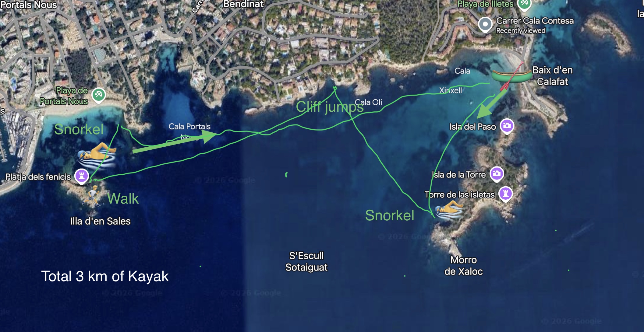 From the starting Location is perfect to visit the following: Cala Contesa, Cala Major, Illetas, portals, Punta Negra, Portal Nous, Island to admire. Google maps kayak Location