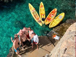 Kayak, snorkeling and coast jumps. 3 activities in 3 hours. We start with kayaking for 20 min, journey to our coast jumping, 2 meters, 5 meters and the last one of 8 meters, all optional and depending on what your adrenaline permits, we continue on the kayak to a nice cool bar with sea view and take a break with some cold drinks. After we kayak to the snorkel spot, get ready and snorkel in one of the only places on the island known for diving school. And this is not all! Still we have the last kayak journey heading back to our starting spot, and if we need more fun! on the way back we stop in a island where we trek to the top for 20 min to an old stone tower from where you can admire the view of almost all beaches of the south bay this tour is Not availible July or August. 40€ per person