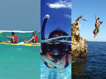 Kayak, snorkeling and coast jumps. 3 activities in 3 hours. We start with kayaking for 20 min, journey to our coast jumping, 2 meters, 5 meters and the last one of 8 meters, all optional and depending on what your adrenaline permits, we continue on the kayak to a nice cool bar with sea view and take a break with some cold drinks. After we kayak to the snorkel spot, get ready and snorkel in one of the only places on the island known for diving school. And this is not all! Still we have the last kayak journey heading back to our starting spot, and if we need more fun! on the way back we stop in a island where we trek to the top for 20 min to an old stone tower from where you can admire the view of almost all beaches of the south bay
